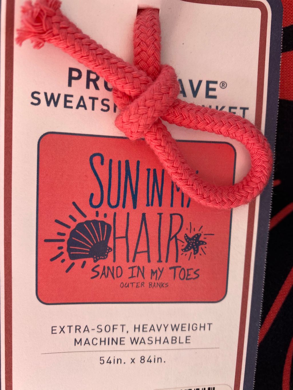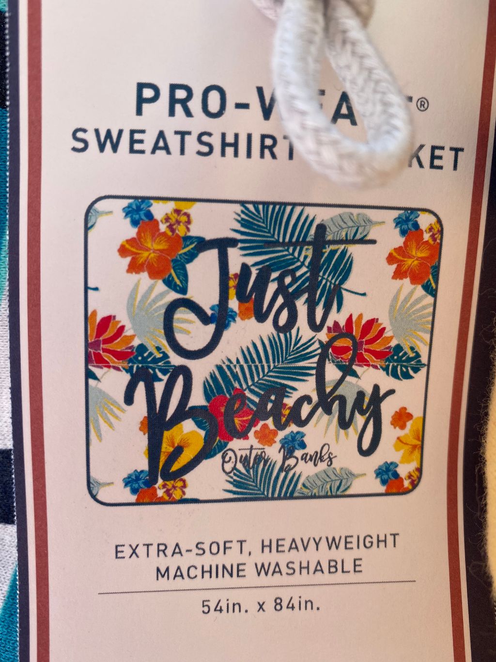 These blankets measure 54" x 84" and are 80% cotton and 20% polyester sweatshirt fleece. The blankets are extra-soft, heavyweight and machine washable. The color choices are green, yellow, coral, and Just Beachy (tropical print). Details for each color are in photos of tags.