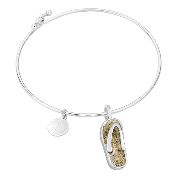 Flip flops are the quintessential symbol of summer fun! Wear your summer memories all year round with our sweet & petite, sterling silver flip flop bangle. Each piece is filled with Outer Banks sand and layered to a slightly recessed, glass-like finish.